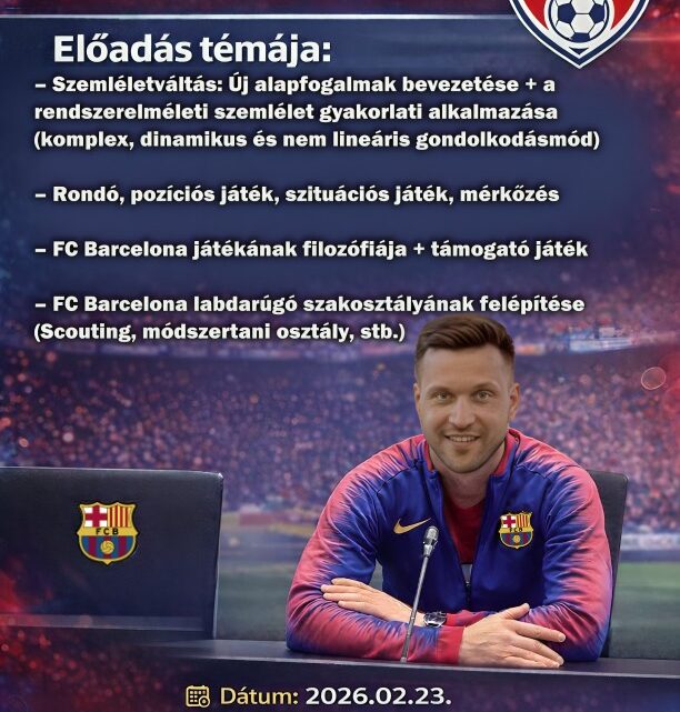 2026-01-23Február 23-án hétfőn szakmai napot szervez Kiemelt Körzetközponként működő egyesületünk, melyre nemcsak a saját edzőinket, hanem a régióban működő egyesületek szakembereit is várjuk. Az egész napos program témája az FC Barcelona képzési elvei, utánpótlás struktúrája, és felépítése lesz, melynek bemutatására Berndt Andrást hívtuk meg, aki évekig Barcelonában tanulta a szakmát és az FC Barcelona különböző képzéseit végezte el, jelenleg pedig a Csákvár szakmai vezetője.